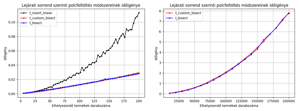 Mivel egy élelmiszerüzlet polcán egy adott márkából ritkán van ezres nagyságrendben termék kihelyezve, ezért a polcfeltöltés időigényének mérését 200 termékig végezzük a timeit modul timeit függvényével. Az eredményt a következő ábra bal oldali grafikonja mutatja. Ezen jól látszik a lineáris kereséssel történő beszúrási módszer másodfokú görbéje. Az is egyértelmű, hogy felezéses eljárással sokkal kevesebb idő szükséges, ahogy a termékek száma nő.