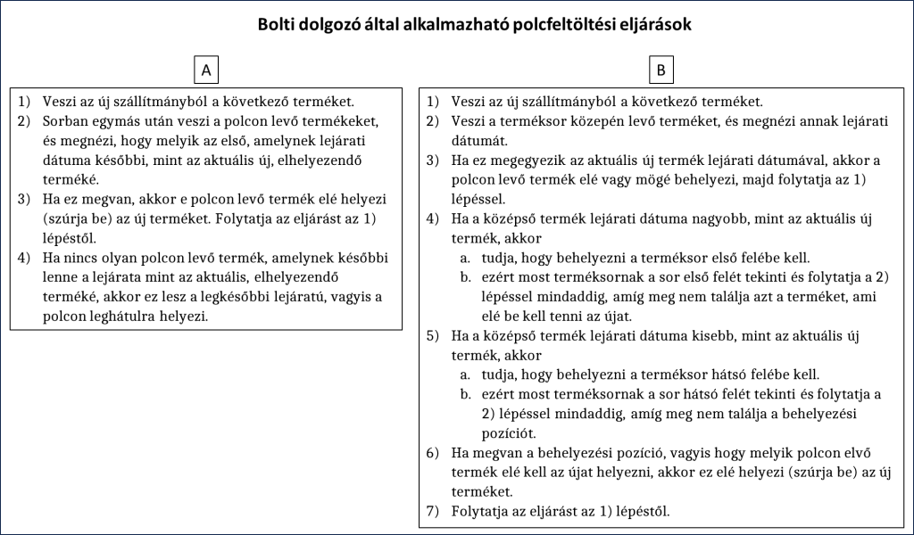 A polc feltöltésének ilyen elvárásnak megfelelő módszere nem az szokott lenni, hogy az új termékeket először egyszerűen felrakják a polcra a még ott levők mellé, és utána az egész polcot – amin így összességében akár többszáz termék is lehet – lejárati dátum szerint sorba rendezik. Ugyanis ki lehet használni, hogy a polcon maradt termékek már dátum szerint vannak rendezve. Így a polcfeltöltést végző bolti alkalmazott választhatja például a következő ábrán látható két eljárás valamelyikét.