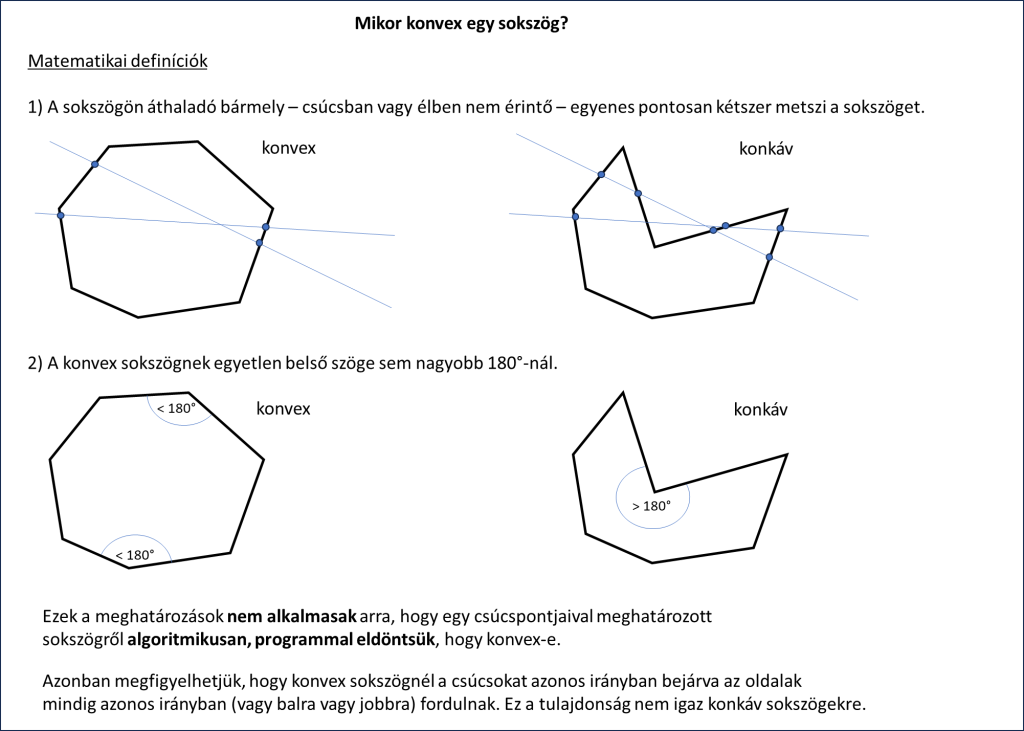 Elsőre a kérdés nem is tűnik bonyolultnak: ránézésre, vizuálisan az emberi szem általában könnyen megállapítja, hogy egy sokszög konvex vagy konkáv. Ha azonban ezt számítógéppel kell ellenőrizni, a feladat korántsem magától értetődő. A programnak ugyanis kizárólag a csúcspontok koordinátáiból kell következtetnie a sokszög alakjára, ezért matematikai szabályokra van szükség, amelyek egyértelműen meghatározzák, mikor tekintünk egy sokszöget konvexnek. Az erre vonatkozó, geometriából ismert definíciókat láthatjuk a következő ábrán.