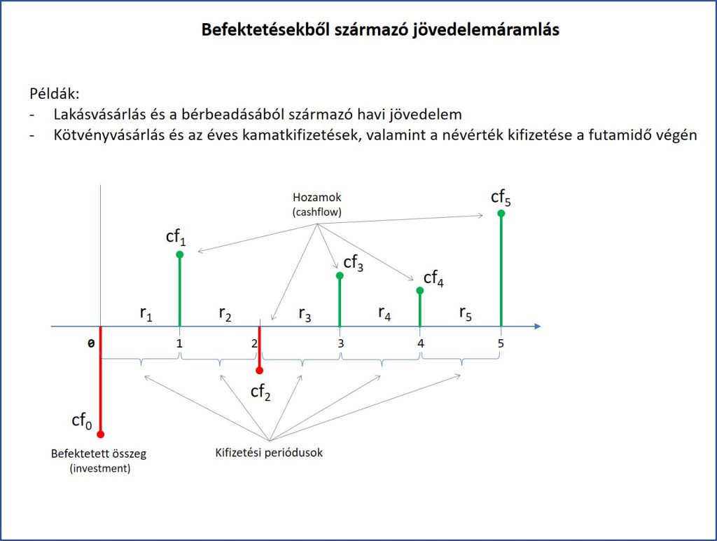 Amikor befektetjük a pénzünket valamibe, pl. részvény, kötvény, ingatlan, akkor most, azaz a jelenben kifizetünk egy összeget és azt várjuk, hogy a befektetésünk tárgya a jövőben hozamot termeljen, amely befolyik a bankszámlánkra osztalék, kamat, vagy bérleti díj formájában. A befektetett összeg tehát mindig kiáramlik tőlünk, míg a hozamok általában befolynak. Azért általában, mert néha az is előfordulhat, hogy a befektetést követően egy időpontban nem befolyik jövedelem, hanem nekünk kell kifizetést teljesíteni. Ez a helyzet például akkor, ha egy ingatlant bérbeadunk, de időközben javítást, karbantartást kell végezni. Ha ennek összege nagyobb az adott hónapban befolyó bérleti díjnál, akkor eredőben kifizetőkké válunk abban a hónapban. Egy ilyen helyzetet mutat a következő ábra, ahol a kifizetések negatív, a befolyó összegek pozitív előjellel szerepelnek.