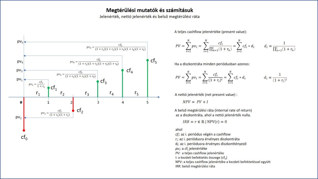 A jelenérték, a nettó jelenérték és a belső megtérülési ráta a befektetések megtérülésének elemzésében alapvető mutatók, amelyek segítenek a befektetési döntésekben, az alternatívák közül az adott pillanatban legkedvezőbb kiválasztásában. E mutatók számítási képleteit foglalja össze az alábbi ábra, ahol, hogy könnyebben megérthetők legyenek a képletek, vizuálisan is próbáltuk illusztrálni a diszkontálás elvét.