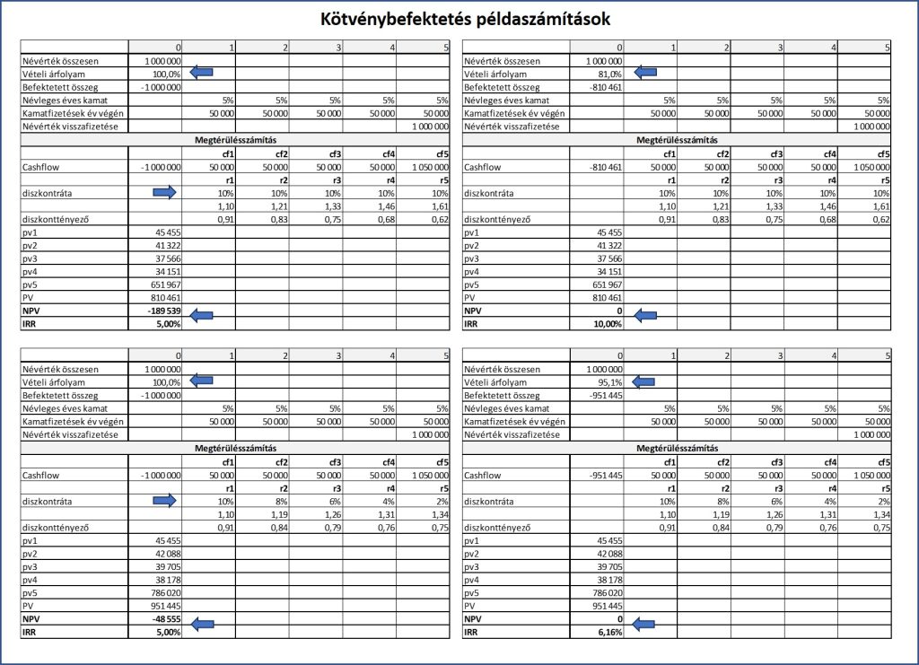 A következő ábrán pedig számszerű példát is láthatunk egy kötvénybefektetésre, illetve annak eldöntésére, hogy vegyünk-e az 5 éves futamidejű, a névértékre vetített évi 5% kamatot fizető kötvényből névértéken. A bal felső táblázatban a diszkontráták (pl. bizonyos államkötvények által kinált kamat) állandóak a futamidő alatt, és magasabbak a kínált 5%-nál. Látható, hogy ebben az esetben a PV kisebb, mint a befektetett összeg, amiből következik, hogy az NPV negatív. Tehát névértéken megvenni ezt a kötvényt nem érdemes. A jobb felső ábra azt mutatja, hogy ha ugyanezt a kötvény a névérték 81%-nál kevesebbért lehet megvenni, akkor jó befektetést csinálunk, mert ekkor az NPV pozitív lesz és az IRR is magasabb lesz az aktuális diszkontrátánál.