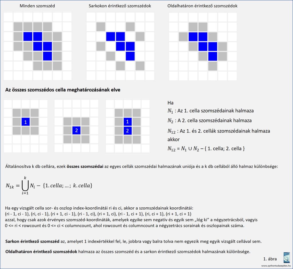 Adott alakzat szomszédos cellái meghatározását halmazokkal és halmazműveletekkel viszonylag egyszerűen el lehet végezni. Ennek elvét mutatja és írja le az 1. ábra további része.