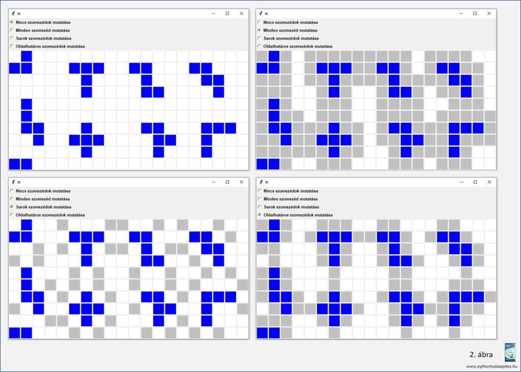 Hogy a szomszédok meghatározását vizuálisan szemléltessük, az elvet az alábbi GUI programban implementáltuk, a get_all_neighbors_coords(), get_corner_neighbors_coords() és a get_side_touching_neighbors_coords() metódusokkal.