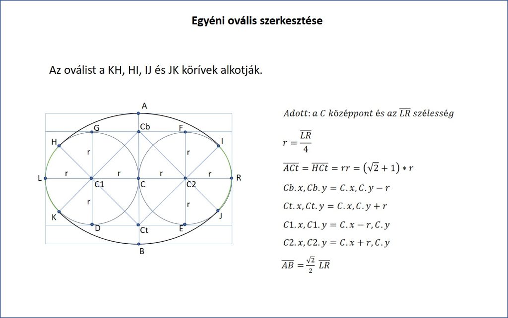 A teljes ovális alakzatot a középpontjával, és szélességével fogjuk jellemezni. Ezeket adottnak véve, az ábrán láthatjuk azon összefüggéseket, amelyek szükségesek lesznek az ovális programbeli modellezéséhez és kirajzolásához.