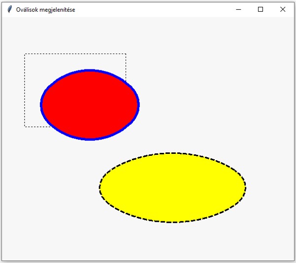 # TESZT root = tk.Tk() root.title('Oválisok megjelenítése') # A vászon grafikus elem létrehozása, amelyen az ovális alakzatokat megjelenítjük. canvas = tk.Canvas(root, width=600, height=500, bg='gray97', highlightthickness=0) canvas.pack() # Kirajzoltatunk egy oválist kék körvonallal és piros kitöltőszínnel. oval1 = Oval(canvas, (150, 150), 200, name='ovális1', outline='blue', width=5, fill='red') oval1.draw() # Ugyanazon a vászon elemen ugyanabban a pozícióban kirajzoltatunk egy másik oválist zöld körvonallal és színkitöltés nélkül. oval2 = Oval(canvas, (150, 150), 200, name='ovális2', outline='green', width=5) oval2.draw() # Az egyéni ovális alakzat számos olyan Canvas metódussal használható, amelyeknél az összetevő rajzelemek # együttesen vannak kezelve, illetve hatásukban és eredményükben nem érzékelhető, hogy az alakzat összetevőkből áll. # Erre mutatnak példát a következő kódsorok. # Kirajzoltatjuk az ovális1 nevű alakzat befoglaló négyszögét. canvas.create_rectangle(bbx := canvas.bbox('ovális1'), dash='.') # Az ovális2 nevű alakzatot vízszintesen megnyújtjuk. canvas.scale('ovális2', *oval2.center_point, 1.5, 1) # Utána pedig áthelyezzük. canvas.move('ovális2', 200, 200) # Az ovális2 alakzat konfigurációját megváltoztatjuk. oval2.itemconfig(dash='-', fill='yellow', outline='black', width=3) # Egérklikkeléssel az ovális1 alakzatot az előtérbe hozás után elmozgatjuk. canvas.tag_bind('ovális1', '<Button 1>', lambda e: e.widget.tag_raise('ovális1') or e.widget.move('ovális1', 30, 30)) root.mainloop() |