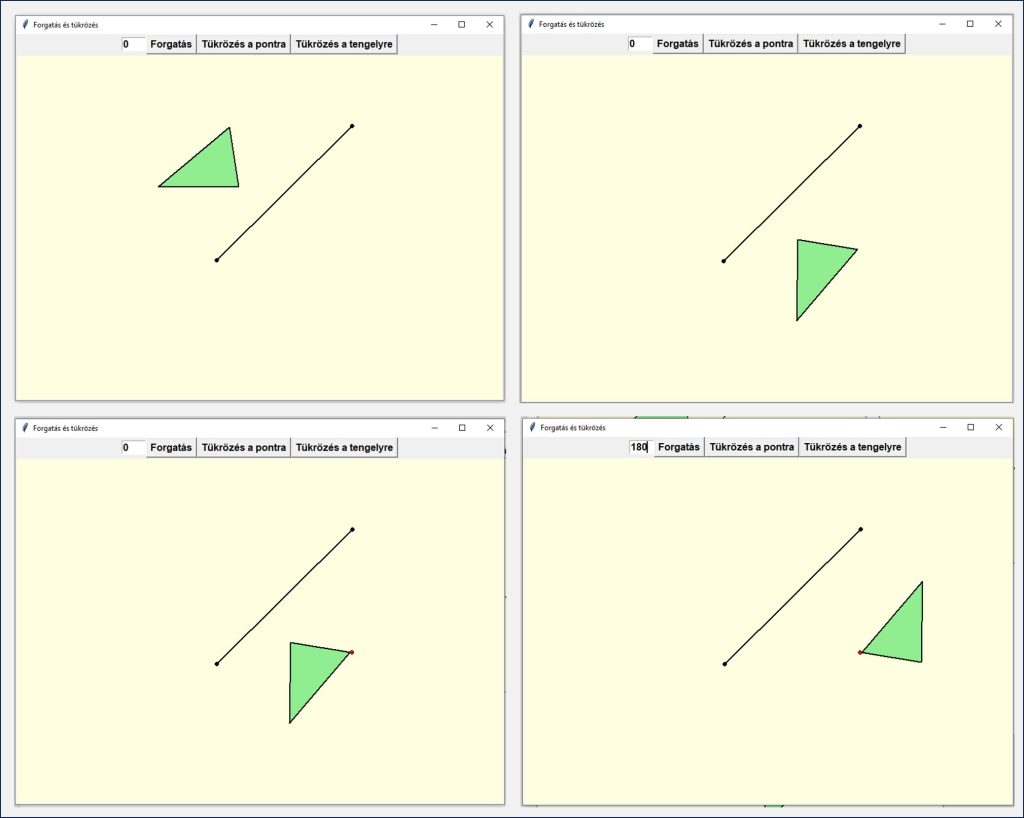 Az alábbi képernyőképeken egy háromszög tengelyes tükrözése, majd egyik csúcspontja körül 180 fokkal történő forgatása látható.