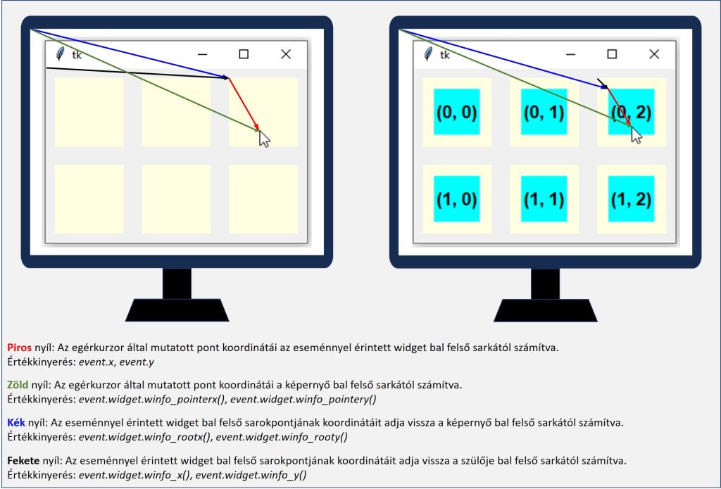 Megjegyzés: a táblázatcella azonosítását a grid_info() metódussal is meg lehet tenni, de most pontkoordináták alapján akartunk dolgozni, ezért használtuk a grid_location() metódust.